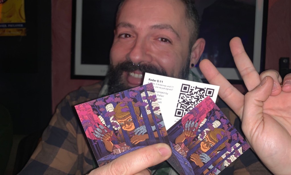 Ecco spiegato perché, per la nostra musica, abbiamo deciso di stampare solamente dei tagliandi, che regaliamo ai nostri live, con il QRcode che rimanda ai vari canali di distribuzione online. È un compromesso tra il nulla e un qualcosa di fisico che veicoli l’artwork stupefacente di Pierpe. Ah, per chi lo amasse tanto quanto noi, può richiederlo direttamente anche tramite lo store dei Radar 5:11 in formato 30×30 cm. Ne vale la pena.